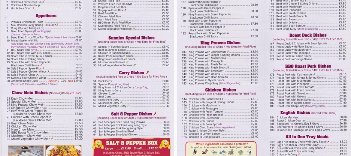 Sunnies specializes in Chinese takeaway and also serves a selection of fish and chips. Expect a blend of traditional Chinese dishes and classic British favorites.